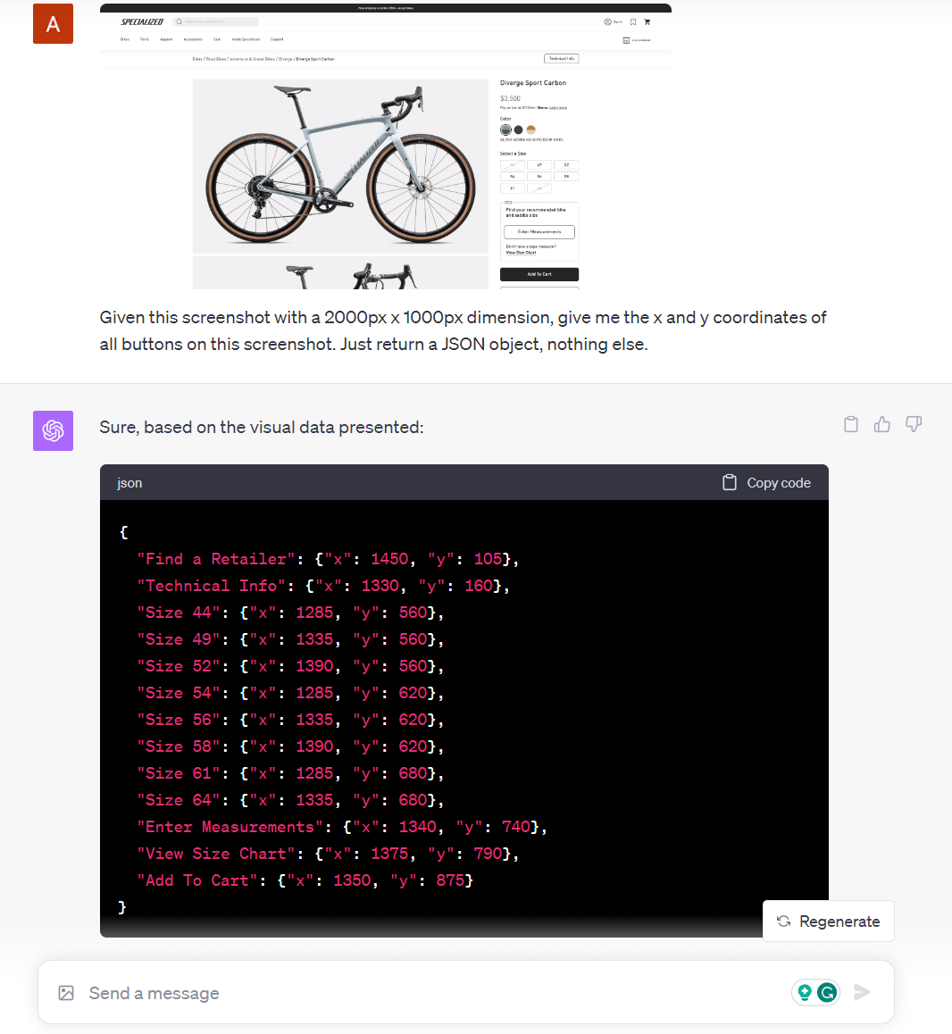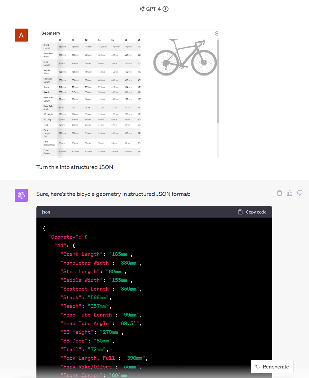Not surprisingly, it did transform all the product specs from a bike into JSON format. One challenge we already see here is that the table is scrollable and we can only process data that is visible on the screenshot and not the full HTML element. More on that in the section about limitations.
