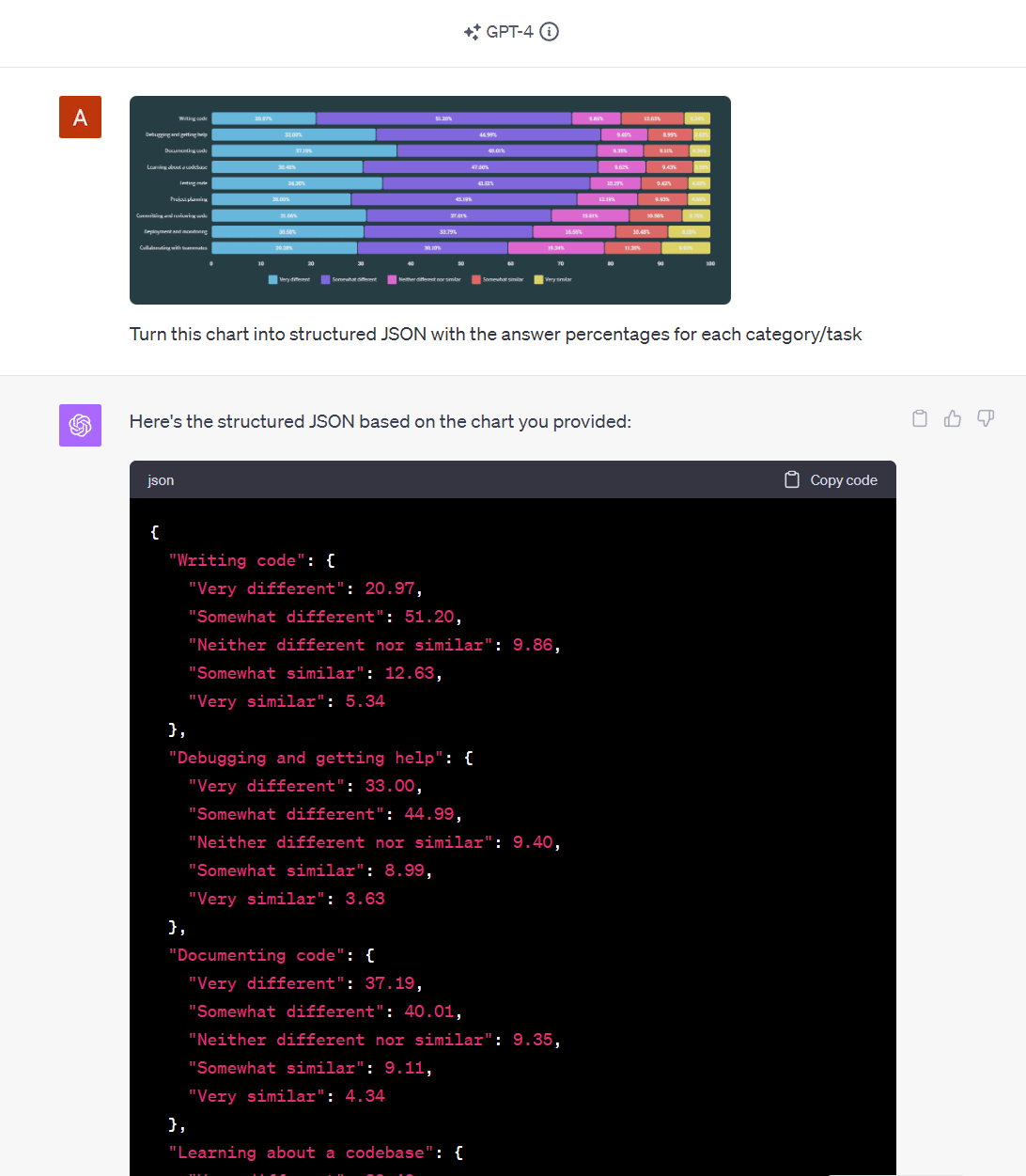 Our next experiment was around extracting data from charts. I took a chart from the Stack Overflow developer survey 2023 website and tried to structure the data.