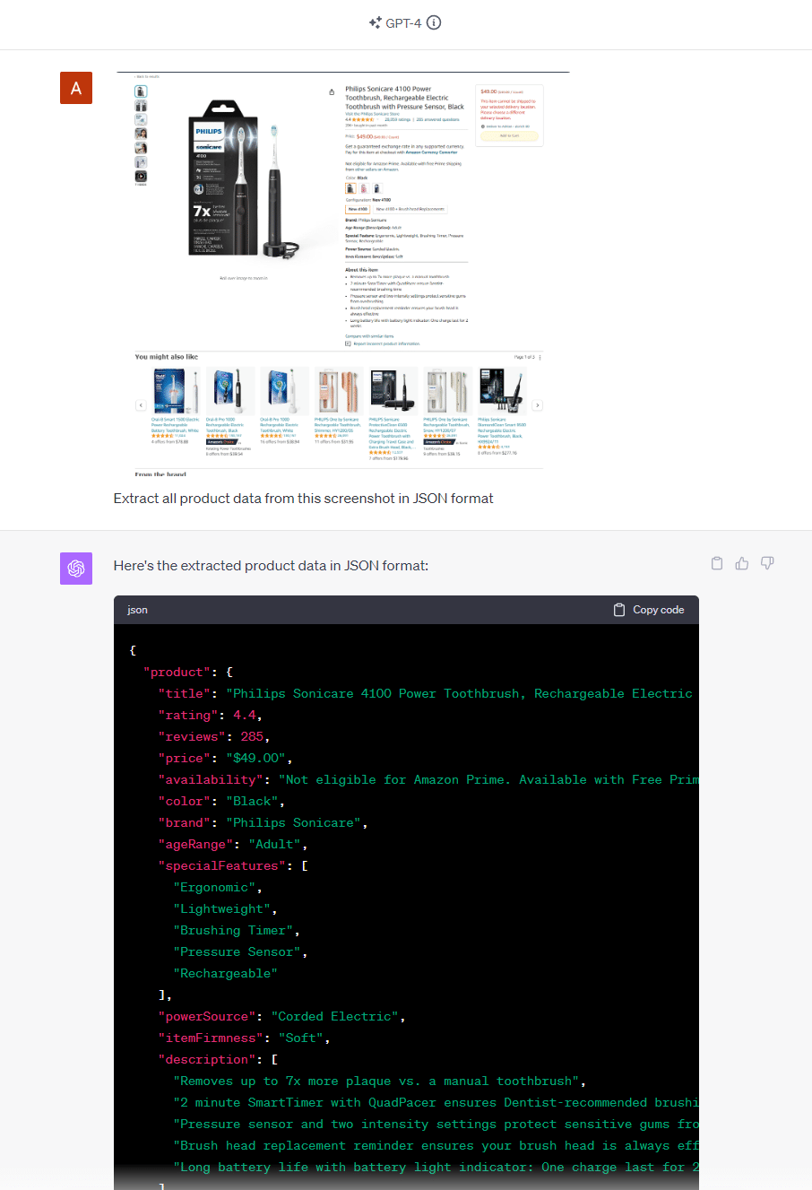 Our first experiment with GPT-4V was to transform a screenshot of an Amazon product page into structured JSON data - a classic web scraping task that would require us to extract each field based on its CSS selector.