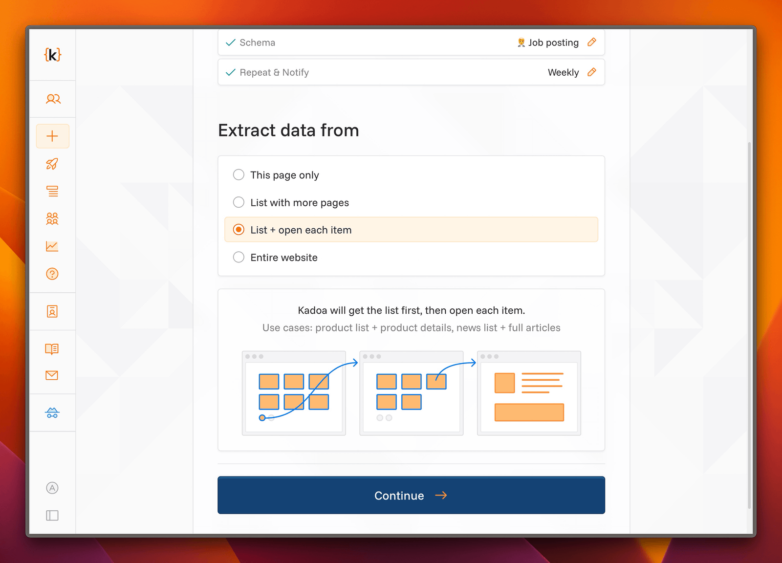 - List + detail pages – Kadoa first collects the list, then opens each item individually.